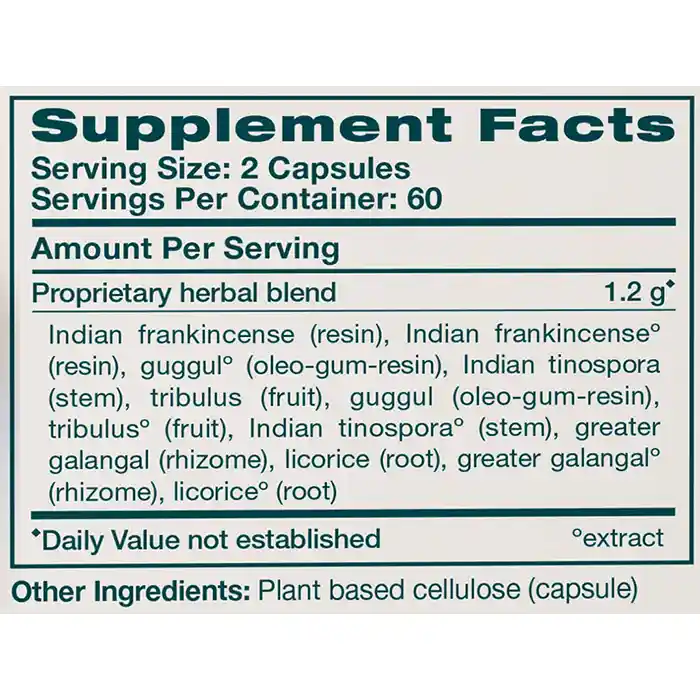 Boswellia, also known as Indian Frankincense, is one of history’s first choices for joint support and integrity. Gokshura, also known as Tribulus, is a longtime favorite of gym-going athletes and is known historically to support the body’s fluid balancing properties. Greater Galangal, a relative of both Turmeric and Ginger plays a role in supporting smooth, balanced movement.*